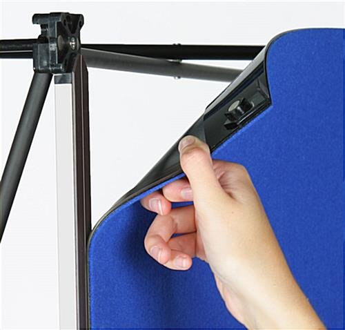 This tradeshow booth, also known as a pop up display, offers a great way to get a customized look at a low cost. Covered with royal blue, hook-and-loop receptive fabric, this tradeshow booth allows to you arrange any combination of accessories that fit your needs. At 10′ wide, this pop up booth is great for use in tradeshows, conventions, and exhibitions. Since these events typically require travel and fast setups, each tradeshow booth is portable and assembles within 10 minutes. Just raise the lightweight frame from the ground and magnetic connectors will automatically snap the pieces into place. The fabric panels then attach to magnetic channels bars along the frame for a clean, seamless look. Attach your selection of accessories and you have a completely customized tradeshow booth in no time at all!