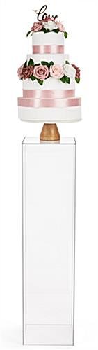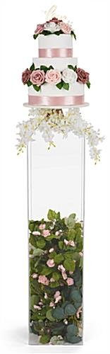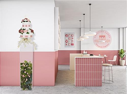 Our tall acrylic display pedestal will help you create visually beautiful showcases in your retail stores, galleries, events, weddings, and more. This clear plinth stands 40″ tall and has a 10″ x 10″ surface area making it perfect for exhibiting vases, desserts, jewelry, and awards. Each transparent tall acrylic display pedestal is five-sided with an open bottom, allowing you to fill your riser with balloons, floral decor, or lights to take your exhibit to the next level. This floor standing plinth is 5mm thick clear plexiglass and can hold up to 35 pounds making for a durable and sturdy fixture. Pair multiple units of these risers together to showcase products, artwork, and more for a sleek and modern exhibit presentation. Our clear tall acrylic display pedestals will make it easy to grab your guest’s attention in any retail store, museum, or event!