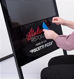 This removable no adhesive vinyl sign is a 10” x 13.75” repositionable accessory that offers a cost-effective way to brand the Displays2go line of digital products. Your full color custom graphics will be printed onto the cling via high quality UV printing technology. Application of the no adhesive vinyl sign is simple, you first clean the digital product that you will be fixing the poster to, wet the application site, carefully place the repositionable poster in place and lastly use the included squeegee tool to remove any bubbles. The suction created allows the cling to adhere to your Displays2go digital product without the need for any adhesive. The custom cling can be easily removed without the use of any tools and leaves no residue behind. Choose to personalize the poster with a full color logo, brand message or original art. These removable vinyl signs are not only cost-effective, but a convenient way to customize your Displays2go digital product.