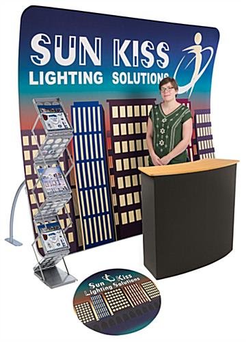 Ideal for trade show vendors looking to upgrade their expo display for a more professional appearance, this curved exhibit booth backwall set offers the basics with a twist to help your business stand out. Featuring uncomplicated assembly and portable features, this 4 piece kit requires 18 days for production time and arrives ready for easy transport and set-up. The 9’ exhibit booth backwall set includes a single-sided backdrop with custom large format graphics, a 36’ x 36” round floor decal, a double-sided magazine rack, and a lightweight counter with hook-and-loop receptive fabric, all of which is modular for your perfect configuration. To make installation uncomplicated, the tension fabric frame features labeled aluminum poles that click together for a sturdy display and dramatic presentation to help your brand message stand out. The portable counter has a large tabletop to distribute marketing materials and, due to the receptive fabric, you can create a custom showcase with hook and loop pockets, sign frames, and vinyl artwork (sold separately). For a sure way to capture attention and promote your brand message, the 36” x 36” floor decal takes advantage of empty ground space with large format graphics that are easy to apply and reposition. Finally, no professional trade show kit is complete without a magazine rack, collapsible for transport and double-sided to ensure maximum visibility for your marketing materials. Featuring a modular design to allow you to set-up for your ideal placement, this booth backwall set only requires 18 days for production time to print the tension fabric artwork and ship out.