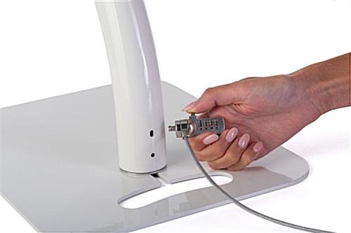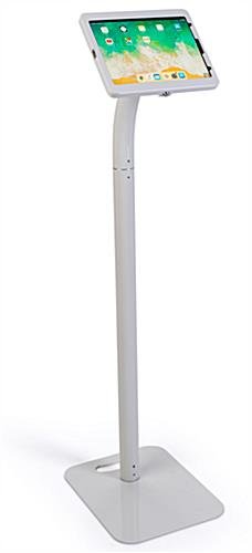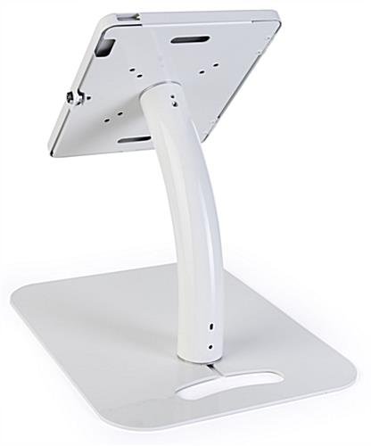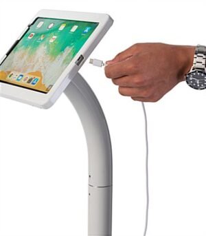 Designed with elegance and practicality in mind, this (3rd Generation) 11″ iPad pro adjustable stand features a heavy rounded corner base, a steel gooseneck pole and an anti-theft enclosure. The sleek, glossy white finish of this tablet kiosk with cable management system lends a professional look to a medical office, car dealership or school library. Each white 11″ iPad pro adjustable stand with sturdy build easily transforms from floor standing to countertop position for complete versatility. The tablet kiosk features an anti-theft aluminum locking enclosure with a set of keys to prevent tampering or theft. To increase security even more, the kiosk also features a Kensington®-style lock slot for peace of mind when leaving the tablet holder unattended. Add convenience and functionality into your lobby with this 360-degree rotating enclosure 11″ iPad pro adjustable stand.