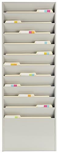 This vertical file organizer with 11 pockets is designed to hold standard letter size folders. The slanted compartments provide easy access to charts and information. Each metal file organizer is made of magnetic steel that allows users to post important notices and memos directly onto the unit. The powder coated, putty colored finish is both stylish and practical, resisting rust and corrosion. A file organizer is great for use in offices and medical practices. With 11 pockets, the unit offers plenty of storage. The slanted compartments keep letter size folders neatly organized and easily accessible to office staff or medical personnel.