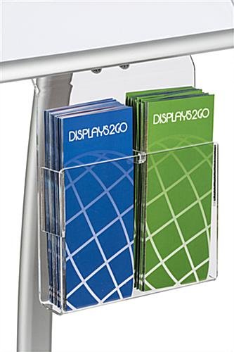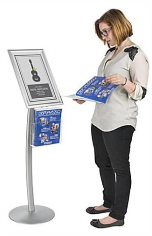 This 11” x 17” silver sign stand with literature pocket is an affordable and effective promotion tool. Featuring a curved design, this floor display is compact and light enough to be easily moved and repositioned. Place flyers or catalogs in the acrylic holder suspended from this curved sign stand to complement your poster. With its snap frame, you can effortlessly change out the graphics framed in this floor display. Keep your sign stand looking fresh and updated by replacing your graphics with an eye-catching poster or design periodically. Additionally, each acrylic holder features a removable divider, allowing you to display one compartment of 8.5” x 11” magazines or two compartments of 4” x 9” pamphlets.