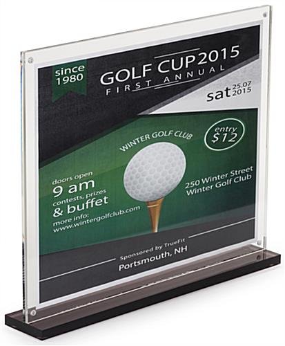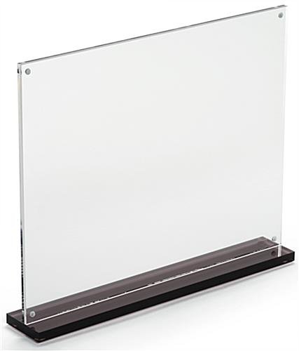 Design unique signage content and display standard sized sheets within this 11 x 8.5 thick plastic upright. Each smoke base sign holder provides a tabletop unit that is aesthetically pleasing. The clear acrylic plastic upright includes polished edges for an undistracted view of graphics. Loading signage into the ad frame is quick and easy with the magnetic button closures. Promote two graphic sheets at once with a sign holder featuring a double sided design. Ideal for a variety of industries, this plastic upright is a staple for any tabletop, counter, or display area!