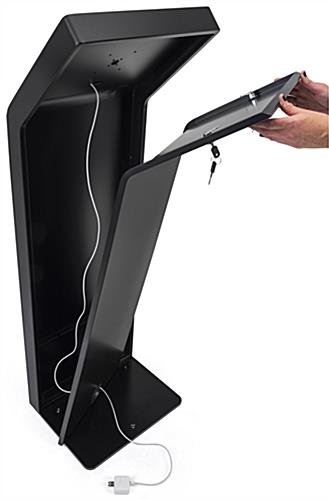 Use the convenient interior shelf to hold a power strip, or place a power bank on the shelf for a completely wireless appearance. For maximum security in high traffic areas, the tablet kiosk stand can be bolted firmly to the floor with the included hardware. Combine this freestanding unit with your device to increase visitor engagement on a trade show floor, provide a digital concierge to hotel guests, or educate museum visitors.