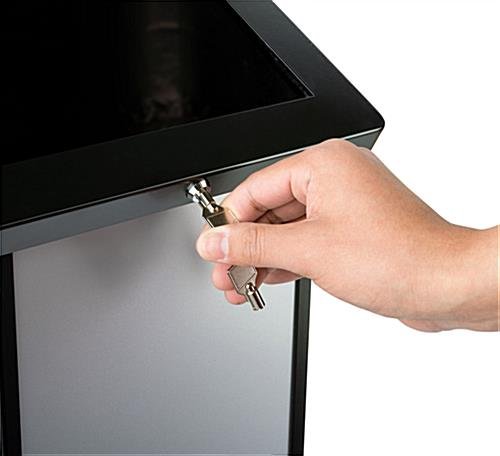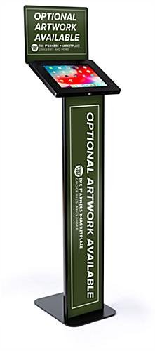 Our customizable tablet info kiosk combines full color graphics with digital touch screen innovation by featuring a magnetic 12” x 9” display above the device enclosure. The steel constructed stand features a modern design with a black and gray finish intended to draw people’s attention and look great in multiple environments. This customizable tablet info kiosk enclosure is compatible with multiple touch screen models and includes locking keys to keep your device safely secured. The stand includes a built-in cord management compartment to keep cables tucked away to avoid clutter and keep your area safe and professional. Reach advertising goals by introducing a display that will serve as a branding tool and as an interactive method to reach out to your customers. Introduce the beautifully designed tablet info kiosk to any environment and modernize your organization’s message.