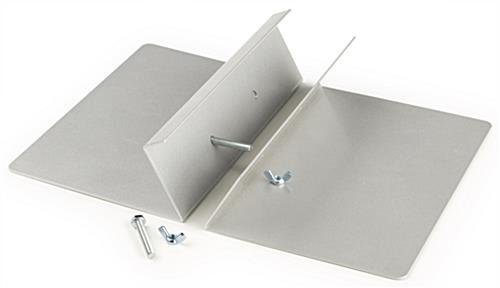 This silver double sided sign holder features a top loading, clamp-like construction designed for holding graphics of varying sizes. When loosened, the poster display extends by 1.5 inches, allowing for signage of differing thicknesses. To assemble the tabletop or floor standing sign holder with graphics, screw the unit’s bolts through pre-made holes in desired brochure displays. Great for use in trade shows and stores, this top loading stand makes it easy to quickly replace signage depending on your display needs. Each sign holder features a durable and solid aluminum construction for tabletop or floor use. Rest assured that this brochure poster display will not easily blow away in the wind!