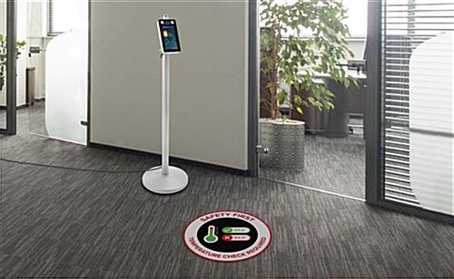 Our “safety first” graphic floor decal helps visibly communicate to guests and employees that fever screenings are required before entering your location. This 12″ round vinyl sticker features a non-skid adhesive bottom that easily adheres to many indoor and outdoor surfaces including carpet, hardwood, laminate, asphalt, and concrete. Perfect for corporate offices, hospitals, or college campuses, each pre-printed “safety first” graphic floor decal maintains its color vibrancy during months of heavy foot traffic. Use this attention-grabbing vinyl sticker to enforce screening protocols and promote virus protection throughout your facility.