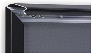 This black 12 x 24 snap frame has a modern style that will complement any advertisement or classic print. The hinged design makes it easy to insert your graphics while ensuring they stay securely centered. This versatile snap frame can mount vertically or horizontally and with the front loading design you can effortlessly switch out posters without taking it off the wall. The included hardware and pre-drilled holes that are concealed underneath the border help make it easy to mount in a desired location. The front loading aluminum design provides a sleek and sturdy display for your posters. Including a non-glare plastic lens, graphics are protected from prying hands, dirt and dust as well as prevented from fading and being washed out by the sun. This snap frame can boldly display vintage posters at home, advertisements in lobbies, or classic movie bills.