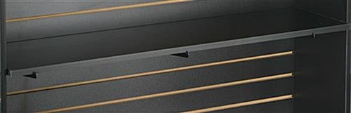 This black slat wall shelf is our wider, 12″d x 48″w shelving option. With this width, the shelves are an appropriate fit for the front and back panels on our black H-gondola, SWH49EBK. The slat wall shelf is constructed from solid melamine, making a sturdy surface for your retail merchandise. Set-up is easy, too! In just minutes, hook our 12″ black metal brackets to the slatwall panels and place the shelves on top. We recommend using 3 brackets (sold separately) to give your shelves added support.