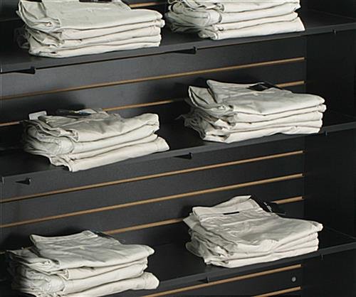 The slat wall shelf is finished in black to match nicely with most store interiors. Create a display for your clothing, food, accessories, school supplies, or any other moderately heavy retail item. Use these melamine shelves and our other accessories to configure a complete store display! A slatwall display provides you with a quick , dynamic, and most of all affordable store fixture. The slat wall shelves are sold individually.
