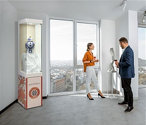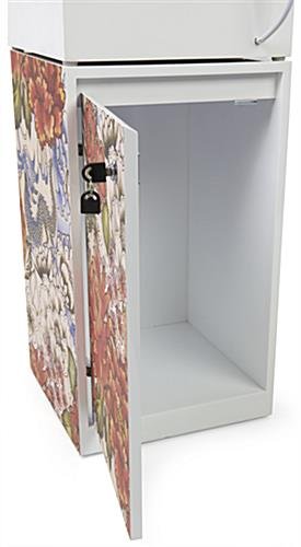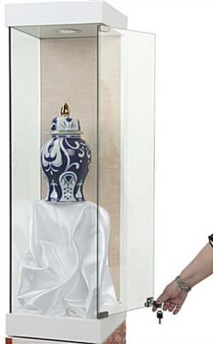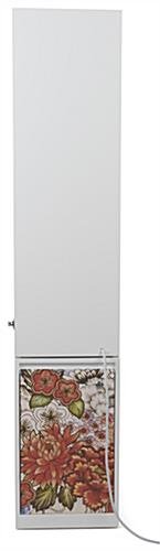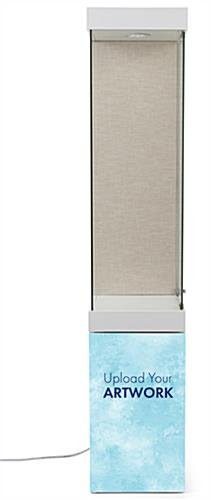 This custom printed LED museum showcase has four panels of personalized adhesive graphics on the base, great for your company logo or advertising message. The floor standing fixture is an excellent branded display option for retail locations, jewelry stores, high schools, and more. This upscale custom printed LED museum showcase has an illuminated interior top light that will enhance the product displayed in any exhibit. The personalized graphics use a PSA (pressure-sensitive adhesive) substrate and offer full-color printing, allowing you to create a unique and vibrant sign. As branding messages evolve, the customized signage on the bottom of the illuminated display case can be replaced over time. The floor standing fixture includes a lockable storage area on the unit’s backside, ideal for tucking away extra product samples. This upscale display case has a tan linen backboard, making it easy to pin and secure heavier items when needed. Our durable custom printed LED museum showcase with tempered glass panels will make it effortless to keep your business marketing up to date at art exhibits, galleries, institutions, and more.