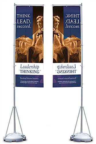 The advertising displays feature aluminum telescopic flagpoles that collapse down for easy storage. In addition, this marketing flag can be set up in a matter of minutes by one person. Banners are attached to the flagpoles at ground level, and then each section is elevated and locked into position. The horizontal flag armature at the top keeps marketing flags clear and visible. This arm also allows a banner to spin around with wind gusts. At the base of the display, a three leg support allocates wind loads. The stability of the unit is enhanced when sand or water is used to fill the plastic bases. This base conveniently fits inside an enclosed travel bag when traveling to and from affairs.