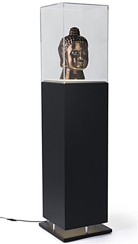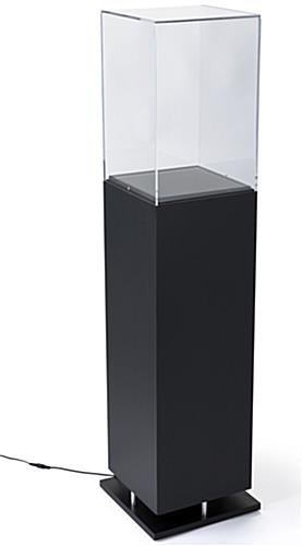 This black pedestal showcase with ambient lighting is a perfect choice for museums, boutiques, or specialty retailers. The LED illuminated top of this display case provides superior lighting for high-end retail merchandise or 3-dimensional collectibles. A 17 inch clear acrylic enclosure fits seamlessly into the edge of this illuminated showcase with ambient lighting for a modern look. The design’s sleek lines are enhanced by LED bulbs at the base of this display case for additional illumination. The square design and eye catching features will bring attention to the pedestal showcase in high traffic areas, while the clear top protects contents from dust or damage. The contemporary black pedestal is designed to complement any environment, while focusing attention on the contents.