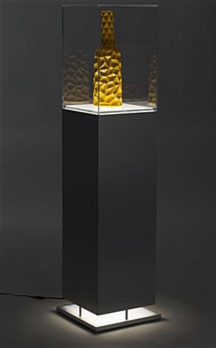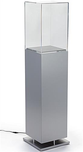 This metal-look pedestal showcase with ambient lighting is perfect for any museum or retail location. A clear acrylic enclosure snuggly fits onto the base of this display case, keeping its contents safe and free of dust. The pedestal showcase with ambient lighting features LED bulbs which will accentuate details, as well as draw people in. This contemporary display case boasts a beautiful and stylish brushed finish and sleek lines. LED illumination spills out of the base, adding to the intrigue of what they will find when they look inside. Adding this beautiful pedestal showcase to your museum or retail location will be a game changer!