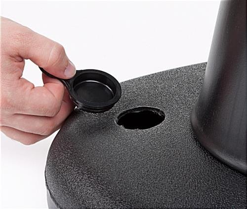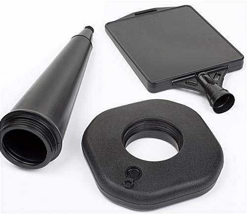 The outdoor cone sign has a signage area measuring 13″w by 15″h. The plastic street sign is double-sided allowing for maximum visibility by possible customers. Each outdoor cone sign is constructed from durable polyethylene, which prevents the unit from rusting and splintering. Furthermore, the black color is neutral for use in any type of indoor or outdoor setting. Each outdoor cone sign has a base that can be weighted down with either water or sand. This gives the owner more flexibility, allowing the plastic street poster holder to be left outside in the wind. The outdoor cone sign that is unassembled takes just mere minutes to put together. Absolutely no tools are required to assemble your plastic street display! At a height 47″ tall, this plastic street display is a sure way to be seen by almost everyone who passes by it! Vinyl graphics are not included with this unit!
