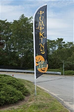 Bring the fall holiday season to your business storefront with this Halloween feather PUMPKINS message flag. The advertising banner stands at 14’ tall and comes with an aluminum pole and ground spike for easy set up. The preprinted feather PUMPKINS message flag features a fun design and graphics to showcase your fall harvest. Writing on the advertising banner is orange on black polyester fabric for easy readability from a distance. Put one of these message flags outside of your business to show off your holiday spirit and attract customers. Outdoor promotions have never been easier than with our imprinted signage, so get yours today!