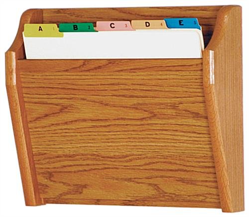 This wall mount single file holder has a slanted document pocket that makes retrieving folders and charts easy. Keep your mail sorted by using this hanging organizer as an inbox outside your office door. This wooden wall mount single file holder fits material up to ¾” thick, making it ideal for holding folders and charts. Keep patient records and other confidential materials hidden from view, thanks to the tall document pocket. Doctor’s offices use this kind of organizer as an inbox at the reception desk, as well as to keep medical charts nearby exam rooms. Easily hang this slanted wall mount single file holder in your workspace with the included hardware.