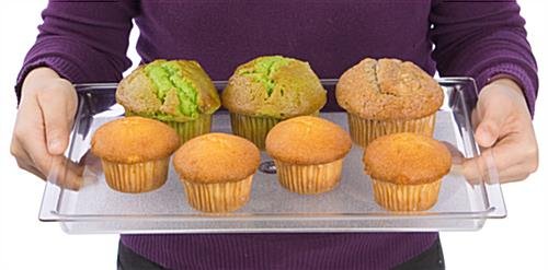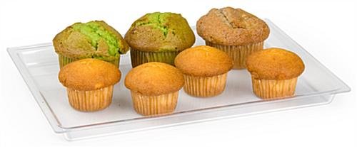 This food tray is a versatile plastic tray. Servers are able to keep all sorts of edibles and beverages on the unit. A food tray, like plastic trays and serving trays, is great for displaying pastries, muffins, cakes, breads and fruits. There is an unlimited amount of options. This food tray has a textured bottom to prevent it from slipping. Even clumsiest of users are less likely to knock the unit from a counter or table. When not in use, the food tray can be easily cleaned. After washing the unit, users can stack the platters to save space. This food tray is also ideal for use with our display cases as well.