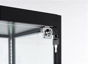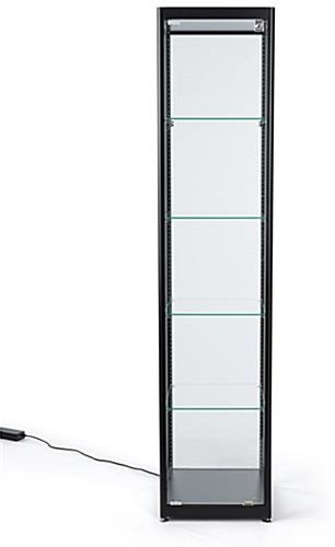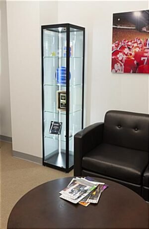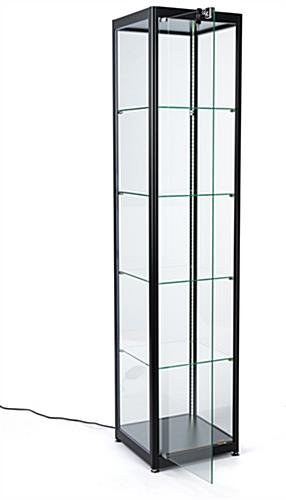 This glass curio cabinet display tower has built-in LED corner lighting to draw attention to awards, personal mementos, or store merchandise. Four adjustable shelves can be easily moved up or down to achieve the ideal height for whatever you wish to showcase. This black aluminum curio cabinet display tower ships to you unassembled. A keyed lock on the door keeps your valuables safe and secure, while still allowing quick access when needed. Silicone edging helps to prevent the tempered panels from rattling against the aluminum corners. Whether for personal use at home or for high value merchandise in a retail setting, this curio display tower is a subtle, yet eye-catching fixture that’s sure to impress.