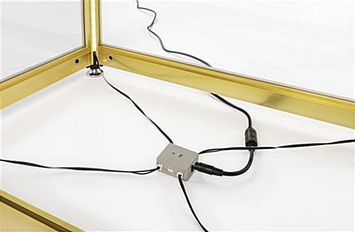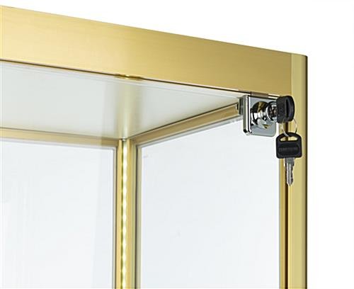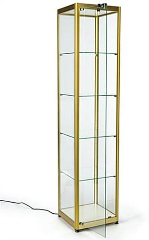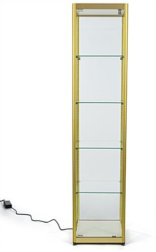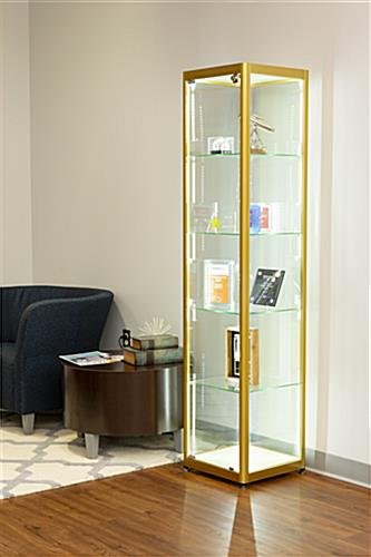 This full glass narrow tower achieves its brilliantly lighted interior through corner LED strips that are integrated right into the frame to create a bold and modern look. Perfectly suited to home, corporate, or retail use, this display case utilizes clean lines and striking coloration to highlight items showcased within. Easily adjust or remove the tiers of this aluminum and glass narrow tower to find the perfect interior height configuration for your items. The locking door keeps valuables secured and allows for quick access with the included key set. Quality of life inclusions like floor levelers and rattle-resisting silicone edging make owning this carefully-considered display case as simple as can be. This narrow tower makes an excellent addition to any modern interior space and is sure to gather compliments from your visitors.