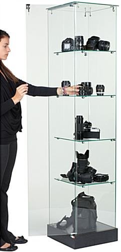 This glass showcase, tower display that has fixed height glass shelves provides 5 levels for placing items. This cabinet includes fixed height shelf pins that provide ample room for merchandise. This tower display that is 71″ tall has hidden wheels underneath the base to easily move. The hinged swinging door requires approximately 17″ of space to open. This retail tower display has an elegant frameless design inspired by European style for an unobstructed view of merchandise. The tempered glass is safer than the annealed type and stronger. This tower display is economically priced and the most affordable style yet! This glass cabinet is great for showcasing jewelry, clothing, trophies, glassware, artwork, historical artifacts, and more!