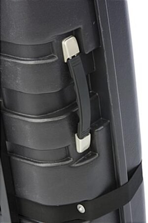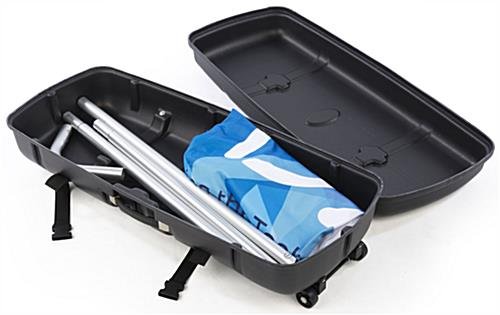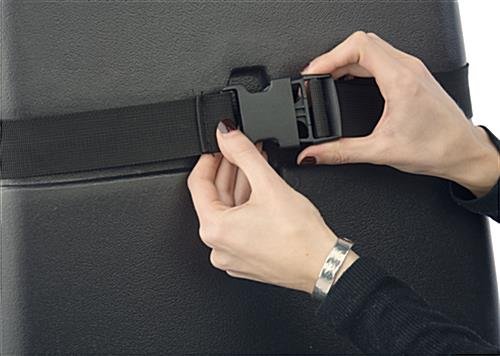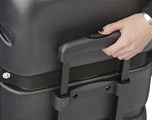 This rolling trade show case is constructed from durable ABS material, providing valuable strength and security to store display products and carry from one expo to the next. Double strap closures secure the two half hard shells in place. Designed with a retractable handle, this display booth case allows for easy maneuverability when navigating through high traffic areas. Carry products and accessories within the spacious interior. Store display fixtures within the hard shell for safe keeping. Additionally, a side handle allows you to carry the case rather than wheel the unit when necessary.