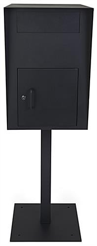 Our pedestal drop box is made of powder-coated steel, making it durable enough to be used indoors or outdoors at libraries, schools, shipping centers, and property management offices. The heavy-duty steel bin features a rubber gasket around the top door to protect the contents inside from inclement weather conditions and closes automatically between uses. This secure locking pedestal drop box is delivered partially intact, allowing for minimal assembly. Two keys are included with the unit, making it easy for property management offices or facilities departments to maintain the interior contents. The base of this locking steel bin also has permanent mounting holes allowing for additional stability in high-winded environments. Our heavy-duty, secure pedestal drop box is the perfect solution for book returns, rental key drop-offs, and more!