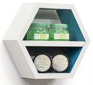 This white hexagon shelf’s exterior is complemented by a sleek teal interior for a contemporary look. The wood honeycomb display ships fully assembled with wall mounting hardware included and will be ready for use upon arrival. Utilize this hexagon shelf on your retail walls and promote a specific line or series together and ensure you don’t miss out on that extra sales space. The wood honeycomb display is constructed out of particle board melamine with PVC edge banding to ensure durability will never be an issue. With the ability to remove the inner shelf of the unit, you can choose whether you want a one or two tiered unit allowing you to display smaller items like candles or lotions, or larger items such as vases or bottles. Order your unit today to add depth and character to your décor and bring the additional sales space you’ve been missing out on!