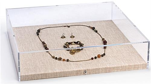 Showcase your paintings, photographs, jewelry, or any art display in this square shadow box gallery frame for a modern wall-mounted or countertop fixture. The clear acrylic case and tan linen base, it will present your studio pieces in classic style. This minimalistic shadow box gallery frame is the ideal 3-dimensional art display for 17” x 17” images or priceless jewels. Simply attach the included hook to the center of the linen base, hang your chosen graphic, and screw the acrylic case on top to preserve and present your artwork. Each unit has beveled Z bar hangers on the back to easily mount to your museum wall and a thick base to use on countertops. Ensure your modern studio design vision is represented in every detail with this gallery frame.