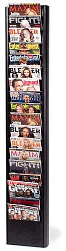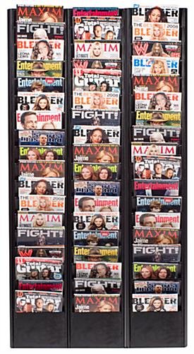This catalog holder, wall magazine rack has (18) pockets to accommodate many magazines. Each pocket is spaced to allow ample room for the magazine covers to be shown. This wall magazine rack, like a mounted catalog display and a literature holder, is made of metal, ready to withstand a lifetime of use. A wall magazine rack features a textured black finish, to fit in with a variety of settings. This mounted catalog holder is the perfect wall magazine rack for use in doctor’s offices, hospital waiting lounges, and other reception areas.