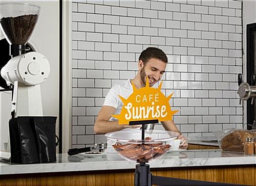 This double-sided foam core sign can measure up to 18″ x 24″ and can be cut into any custom shape. Each lightweight 5mm poster board is printed using a high-quality UV printing that has a bright and vivid finish. This customized 2-sided foam core signage is perfect for your bakery displays, retail store promotions, trade show booths, or medical centers to get your advertising messages communicated creatively to your customers and clients. The lightweight design makes it easy for you to display in a variety of areas, and the high-quality image lasts for a long time. This customized poster will make it easy to get your marketing messages and product promotions to stand out. Our custom shaped foam core signage is ideal for any cafe, medical office, hospital, retail store, or trade show booth!