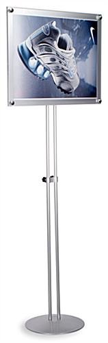 We sell these sign stands with an acrylic sign holder. To attach the acrylic sign holder to the sign stand you merely have to screw the bottom acrylic plate to the stand, place your literature on the bottom plate, and attach the top acrylic plate using the four metal knobs provided. These sign stands, also known as poster stands, come with adjustable height capabilities and instructions are included! The sign stands can go from 34 ½” to 61″. We sell these sign stands with adjustable heights so they can be modified to fit the space in which they are being placed. A higher height setting is better if people need to view it from far away or over a crowd. Lower height settings are perfect for eye-level viewing. The sign holders also have the outstanding feature of being able to rotate 180 degrees so you can have it facing any direction you wish!