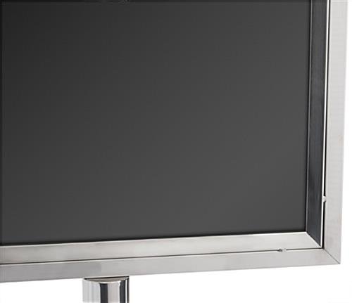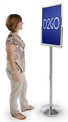 This sign mounting stand holds 18” x 24” vertically-oriented posters. The floor-standing fixture measures 69 inches tall and features a top-loading design for effortless setup. An inner backboard, as well as 2 non-glare lenses, allow users to create a double-sided presentation using 2 posters at the same time. Simply slide the graphics in-between the non-glare lenses and the backboard. This sign mounting stand has a pedestal-like design with a heavy weighted round base for added stability. The stainless steel sign holder for floor is part of the UpLuxe series of poster frame stands.