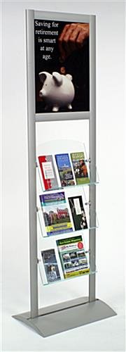 The catalog holder is constructed from brushed aluminum and features a smooth silver finish for additional elegance. This indoor fixture, catalog holder is therefore resistant to rust! The publication rack is also an adjustable catalog holder! We provide this catalog holder with moveable brackets, allowing you the freedom to alter your stand. The catalog holder also has an 18″w x 24″h graphic area for advertisements or eye-catching posters. We even provide the catalog holder with (2) clear, plastic lenses to protect your graphics and present you the option of creating a double-sided fixture. This catalog holder, also known as a literature system, is an eye-catching fixture you and your visitors will love!