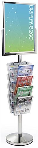 This 18 x 24 floor standing sign with magazine holder boasts steel construction with a modern chrome finish. Clear acrylic literature racks compliment the design of the stand while offering a tiered view of its contents. The double sided sign can hold large sized prints in the frame for advertising while also distributing various reading materials with the pockets. The literature racks are crafted from high impact acrylic that is proven to withstand the test of time. Setting up your display is as easy as screwing the pole into the base, attaching the bracket, and hanging the pockets. Place this floor standing sign in high traffic areas to further increase your brand exposure.
