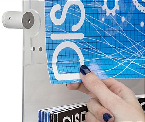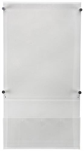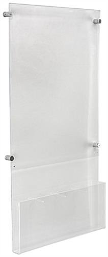 This 18” x 24” poster display with adjustable literature holder provides alternative setup configurations for brochures, magazines, catalogs, and pamphlets. Rather than being limited to only one size of company marketing materials to showcase, these wall mounted sign stands are capable of providing added variety for featured print outs. Inserting advertisements are easily achieved with these poster display sleeves that securely close with button magnets. Stock each divided pocket with company information leaflets, tourist maps, university flyers, or memo handouts capable of accommodating either (4) 4” x 9” sheets or (2) 8.5” x 11” booklets. As opposed to regularly positioning freestanding sign stands, these wall mounted units can easily be affixed using the provided installation hardware and silver edge grip standoffs. Manufactured from clear acrylic, each poster display is durable and frames art designs and pamphlets without distracting from the advertisement being showcased.