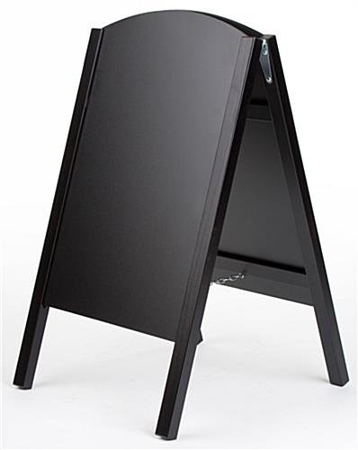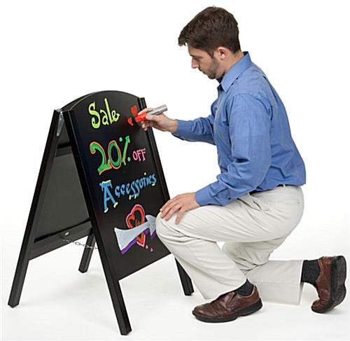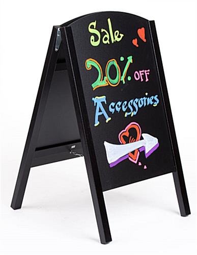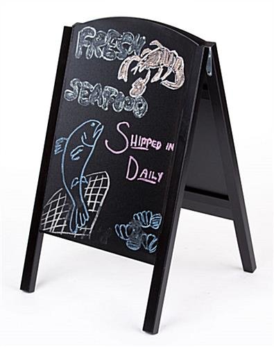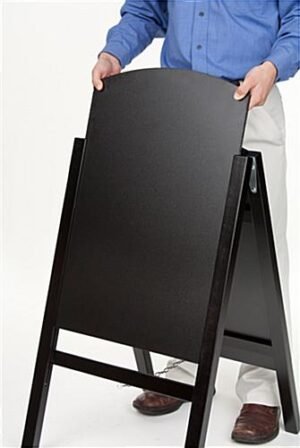 An a-frame blackboard, chalkboard easel is a perfect way to publicize alluring messages. By using this write-on board, it can help grab attention and as a result, will increase the number of customers in your establishment. This chalkboard easel, also known as a-frame blackboard, has a wood frame with a black finish that blends in perfectly to any environment. Each unit has two slide-in chalkboards that are 18″ wide by 26″ high, giving users plenty of space to create their own messages. Business can use this chalkboard easel that has a black wood frame to advertise sales events, daily specials, on-going promotions and announce important information. Passersby’s coming from both directions will be able to view the message on the board. This write-on blackboard, a-frame chalkboard easel that is double-sided enables advertisers to use both sides to create their custom messages.