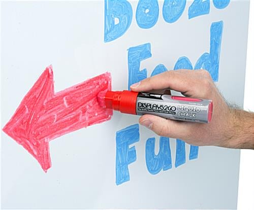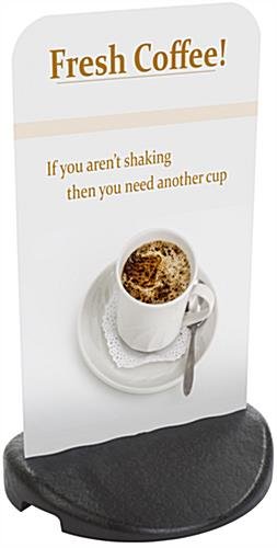 Create unique attention grabbing product advertisements with this weighted base curb sign. The 18” x 31” writing area is crafted from aluminum for durability and long lasting use. Each double sided sign features a built-in carrying handle that can be used to quickly move the display into high traffic areas for greater visibility. The black bottom has enough weight to stay securely on the sidewalk in winds over 70mph! Easily setup your sign by securing it with the nylon fixing underneath the display. Print graphics directly onto the double sided panel or use liquid chalk to create your own artwork. Use this sidewalk fixture to promote products in stores, malls, or on other busy roads for an attention grabbing advertising solution!