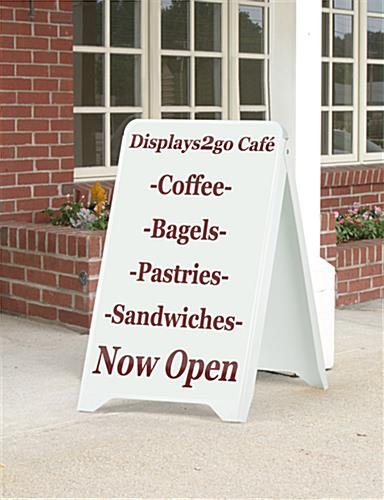 Use this custom graphic sidewalk sign for outdoor promotion at your local business or hotel. The decal designed message boards are lightweight, portable, and are great for displaying new sales for your store. Each outdoor sidewalk sign is made of polystyrene material and is an easy setup by simply unfolding the A-frame and placing it in an ideal location for customers to see. These decal designed message boards provide a great addition to your business by selecting from our list of fonts and PMS colors to help promote new features or products. The sidewalk sign offers an 18” x 32” display area to accommodate large advertisements for customer viewing when placed outdoors. While in use, the A-frame will make a great addition to promote your new start-up company or even advertise the lunch menu for the day at your café.