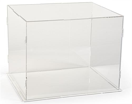 This large clear display riser case puts the spotlight on featured merchandise, samples, or collectibles. The portable acrylic cube design offers all-around viewing, so guests in your retail store or industry event booth can inspect every facet of a new product or conceptual model. Break down this collapsible countertop large display riser case with ease, thanks to the flat-pack build. All six pieces can be disassembled into a neat, portable stack and stored away or shipped to your next event. And setup is just as easy – the tab and slot design requires no tools for assembly. The clean, frameless aesthetic of this large display riser case is perfectly suited to both longer-term retail applications and quick-turnaround trade shows.