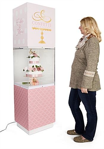 Our unique bottom lit pedestal display with custom graphics is the ideal unit to showcase various high-value items, fragile artifacts, or jewelry. This beautiful free-standing illuminated plinth features an acrylic center presentation area, providing patrons with a full 360-view of your featured product. Bring your own style to this premium white bottom lit pedestal display with custom graphics by uploading your creative design, company logo, or brand messaging onto eight individual panels. The clean look and feel are enhanced by a frameless clear acrylic cube placed in the center providing ambient lighting and helping to set your merchandise apart. Our well-constructed free-standing showcase will support products up to 110 lbs., is easy to prop and reprop, and ships in 3 pieces for quick setups. Adding this premium white illuminated pedestal display with custom graphics on top and bottom areas to your museum or retail location will be a game-changer.