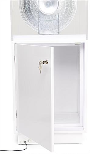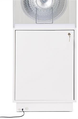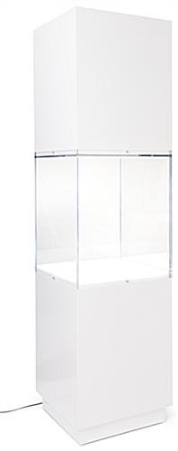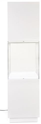 This beautifully illuminated pedestal display case with a bottom lit LED panel is a perfect choice for museums, boutiques, or specialty retail shops. The 74” in tall showcase makes an impressive statement, and the full acrylic cube center provides patrons with a 360-degree view of the featured product or artwork. This modern designed illuminated pedestal display case is well built and features a convenient locking storage area in the back of the unit, and has a weight capacity of 110 lbs. The bottom lit LED panel will set your high-end retail merchandise in ambient lighting, and the 17.5” x 20.5” presentation area provides ample room for a variety of products. Position this showcase in a retail window, against a wall, or even use it as a free-standing unit for all-round visibility. It’s easy to see why this beautifully illuminated pedestal display case with a full-view acrylic center is perfect for attracting patrons to your featured new product or piece of art.