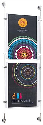 This wallmount sign, also known as cable displays, is perfect for businesses looking for relatively low cost signage that grabs the attention of the customer. This kit includes custom designed satin silver finished hardware for an elegant look to blend well with any environment. This suspended signage kit, wallmount sign includes a crystal clear acrylic panel with a simple to use top-insert design. Users can quickly switch out marketing materials according to business needs. This wallmount sign is part of a large selection of cable kits in all different sizes and configurations. Purchasers can choose a pre-designed set or create a unique matrix by combining multiple different kits.