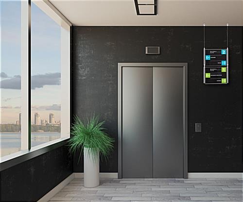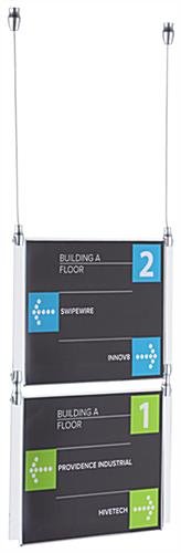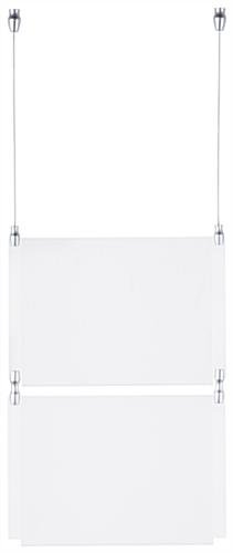 This window advertising sign, also known as cable suspending signage, is versatile and looks great in many environments. The crystal clear acrylic panels included in this system are eye catching yet take up little space. The suspending hardware included with this window advertising sign allows users to install in a storefront display, above a counter, or on virtually any ceiling. This display can be utilized in retailers, restaurants, hotels, art galleries, real estate offices, and more! This window advertising sign looks great in storefront displays to attract passerby customers. Purchasers can maximize use by placing graphics back to back for a double sided display.