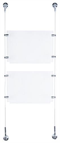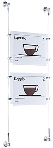 These hanging signs, also known as cable displays, are perfect for businesses looking for relatively low cost signage that grabs the attention of the customer. This kit includes custom designed satin silver finished hardware for an elegant look to blend well with any environment. These suspended signage kits, hanging signs include a crystal clear acrylic panel with a simple to use top-insert design. Users can quickly switch out marketing materials according to business needs. These hanging signs are part of a large of selection cable kits in all different sizes and configurations. Purchasers can choose a pre-designed set or create a unique matrix by combining multiple different kits.