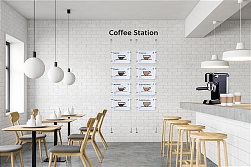 These hanging signs are a practical yet visually appealing advertising display. The versatility of this display is the reason it can be used in many different businesses such as retailers, art galleries, real estate offices, college buildings, and more! These hanging signs come with all of the needed hardware to install. The included 1/8″ thick acrylic panels have a thin profile which adds to the light and airy appearance of this kit that takes up little room. Businesses can get rid of outdated, bulky displays with these sleek and professional hanging signs. This kit is convenient and takes the guesswork out of creating captivating visual merchandising displays in businesses.