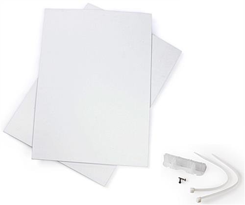 The white plastic sign with mount kit includes mounting hardware, including two zip ties to affix signage around a pole or other circular upright. Custom signage is secured to the bracket by inserting the corrugated edge of the sheet into the channel, then fortifying it with two screws (included). This set, plastic sign with mount only requires eight additional #8 screws (not included) for wall mounting. The two included inserts are blank and can be decorated with colors or letters, or can be printed with a custom design at a local print shop. Printing is not included. This plastic sign with mount that can be reused is a cost-effective option to create new displays utilizing the same kit. The hardware is versatile and can be adapted to fit on corners, such as tables or square posts, circular uprights, such as telephone poles and pipes, and smooth surfaces, such as a wall or ceiling.