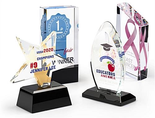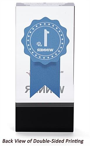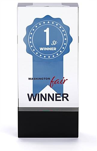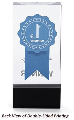 Select this crystal rectangle participation trophy with a black bottom and 2-sided custom printed graphics when you are looking to recognize outstanding performance or service longevity. In today’s environment, it is important to acknowledge those individuals that have helped you achieved success. This stunning 2.75” x 6” crystal rectangle participation trophy is perfect for award presentation in corporate environments, county fairs, universities, and charity events. With a great weight and light-reflecting angles, this piece will dazzle all who behold it. Whether you are looking to recognize dedicated employee service, teacher of the year, or best blueberry pie at the country fair, our 3D custom printed graphics will make a lasting impression. Honor your exceptional recipients with this rectangle participation trophy at your next awards ceremony.