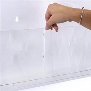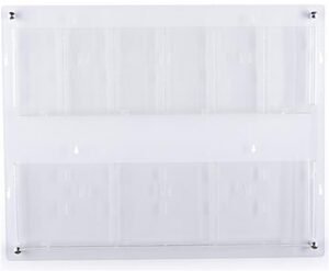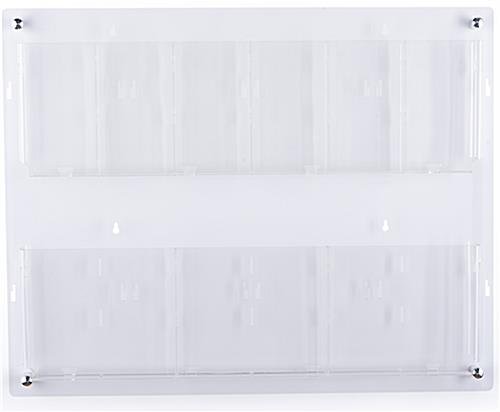 This wall mounted magazine rack is a modern, user-friendly, multiple brochure holder with 6 clear acrylic pocket dividers to fit pamphlets and catalogs in community centers, doctor’s offices, waiting rooms, schools, and more. Our 2 tiered literature display ships fully assembled making, the installation process effortless. The plastic dividers easily insert into the clear wall mounted magazine rack, allowing you to stock bigger catalogs and smaller pamphlets together on one fixture. This USA-made design includes 4 metal standoffs to provide a sleek appearance to your workplace. The multiple brochure holder is excellent for promoting new products while providing takeaway literature to customers waiting in line or walking by your store. Use this 29″ x 23″ contemporary transparent wall mounted magazine rack in any boutique, retail store, travel center, and more.